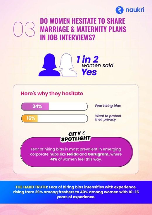 Hiring Bias and Hidden Personal Plans: One in two women hesitate to share marriage or maternity plans in interviews due to fear of bias (34%), intensifying with experience from 29% among freshers to 40% for those with 10-15 years.
