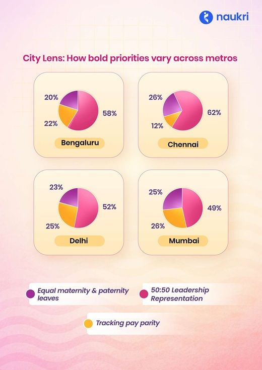 Key callouts include a dramatic rise in calls for equal pay audits, jumping from 19% to 27% year-over-year and tying with menstrual leave as the top policy ask; leadership encouragement leaping to 83% from 66%, signaling stronger ambitions especially in southern metros; and eroding trust in pay parity, with 33% disagreeing—up from 25%—as gaps widen with career advancement.