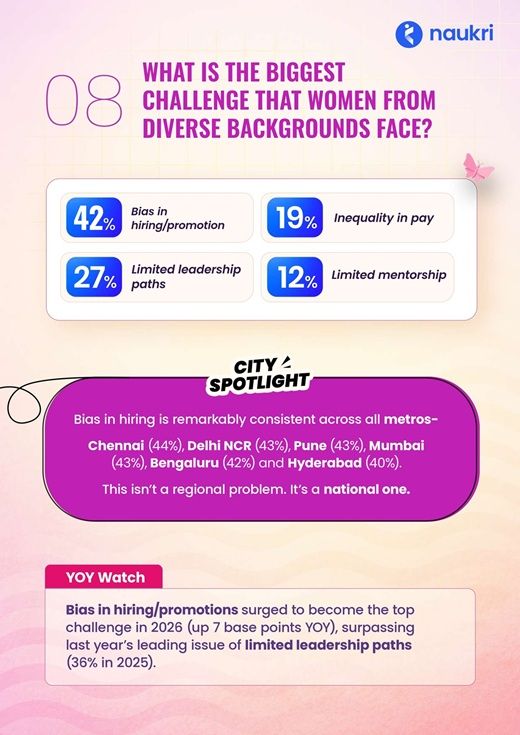 Persistent Bias as Top Challenge: 42% cite bias in hiring and promotions as the biggest hurdle for diverse women, up 7 basis points YoY, consistent across metros like Chennai (44%) and Delhi NCR (43%).