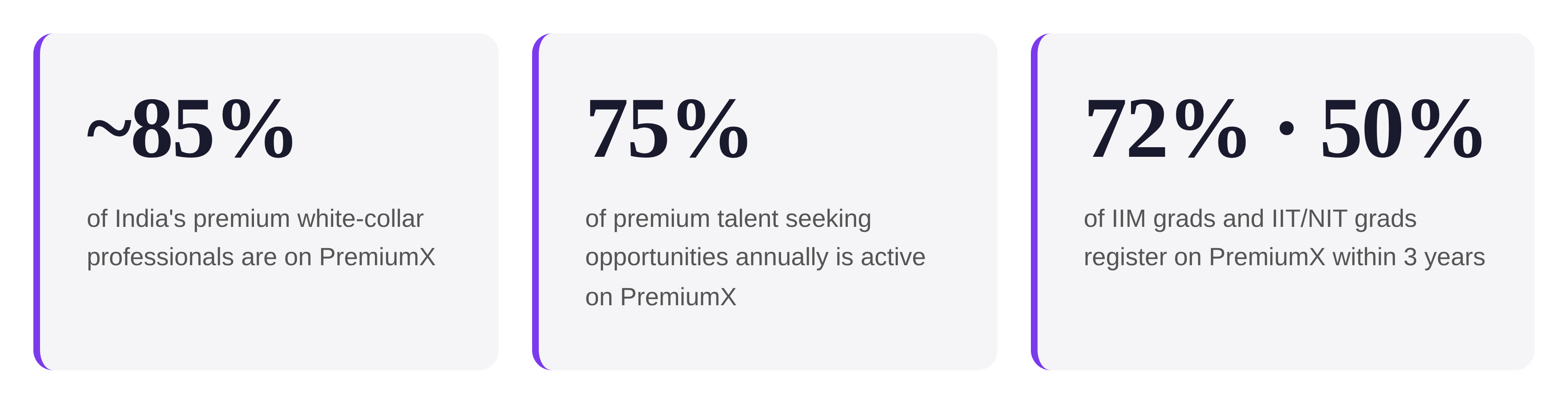 Before discovery can be fast and accurate, the pool itself has to be deep enough to trust. PremiumX is built on the most comprehensive premium talent dataset in the country — covering active and passive professionals across seniority, sector, pedigree, and geography. In short: if a premium candidate exists in India, the odds that they are on PremiumX are very high.