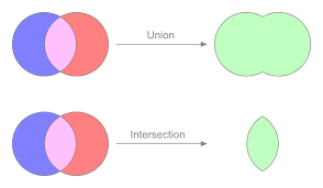 As we read in the previous section, the Union operation returns the combined region of two or more shapes, as shown in the figure below. In comparison, the intersection operation takes two or more shapes as inputs and returns the intersection area between them, as shown below.